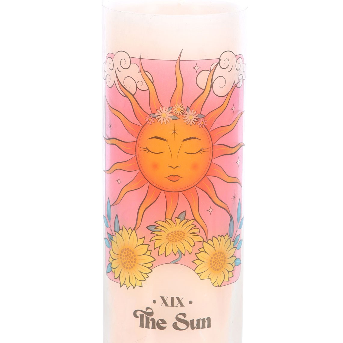 This pink grapefruit scented tube candle is a vibrant addition to anyone's room, casting a warm glow while filling the space with an energizing citrus fragrance. Featuring the radiant design of 'The Sun' tarot card, it's perfect for those who share their aesthetic lifestyle on social media or enjoy curating their unique space. This candle not only lights up the room but also uplifts the spirit, making it an ideal companion for both meditation and study sessions. Paraffin wax. Approximate burn time of 70 hours. H21cm x W6cm x D6cm.