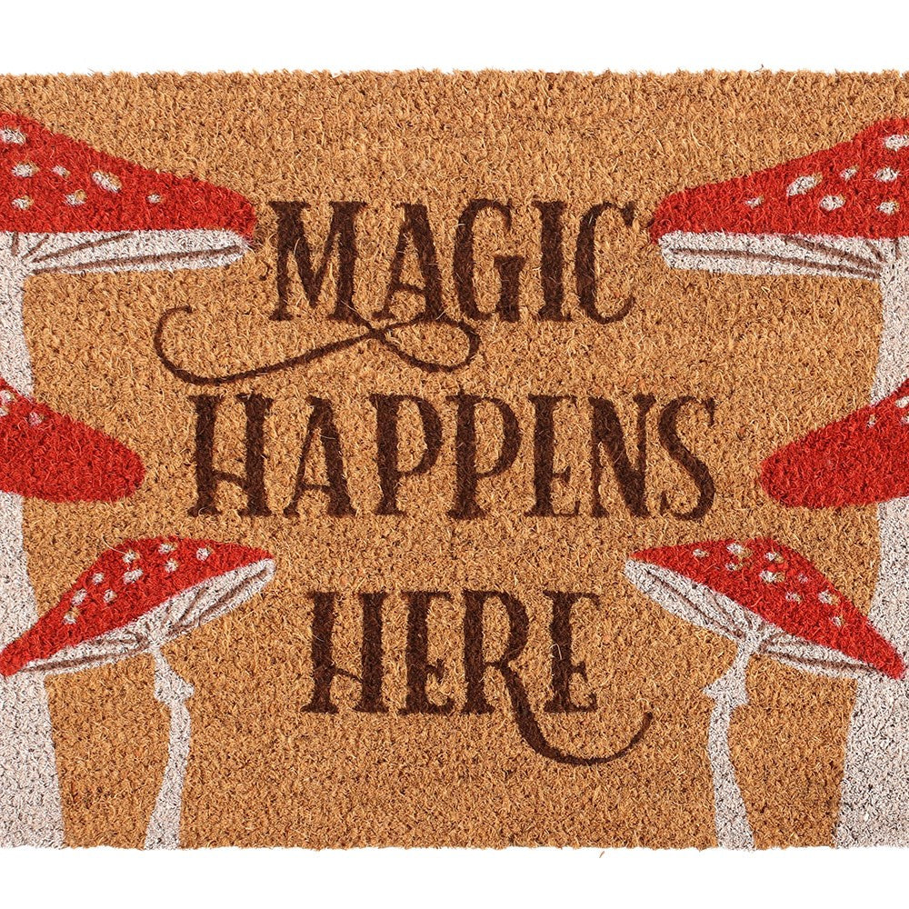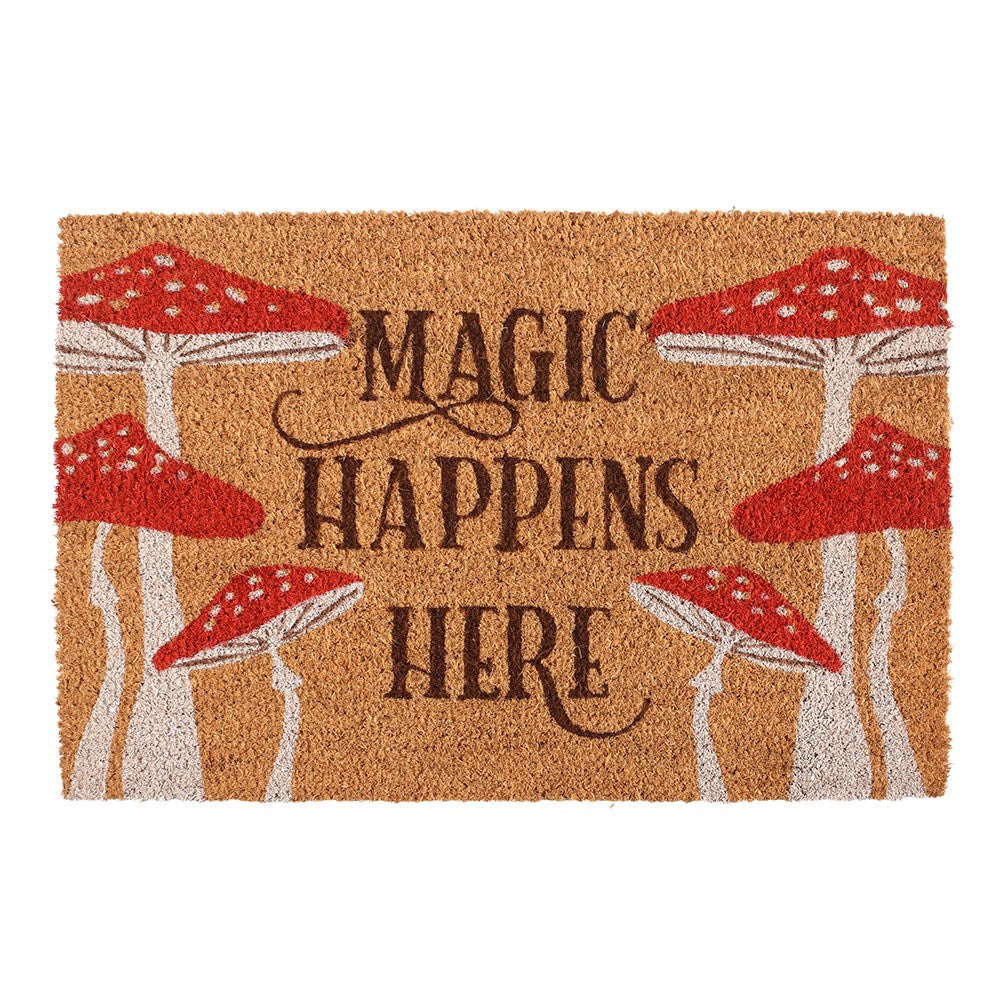 Give your visitors an enchanting welcome with this 'Magic Happens Here' toadstool design doormat. Perfect for brightening up porches and entryways and adding a touch of magical charm. Design may fade in extreme weather. Suggested for sheltered and indoor use only. W60cm x D40cm.