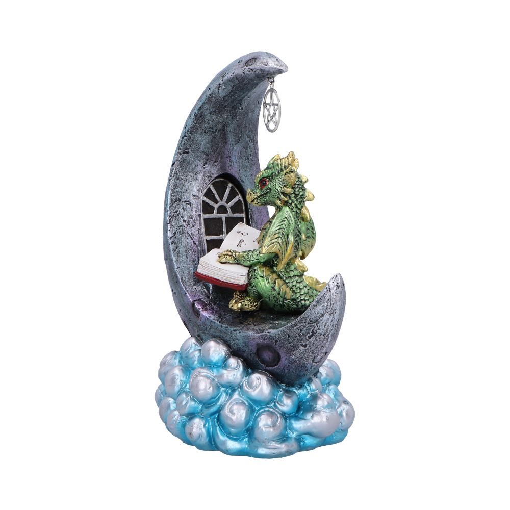 A whimsical and mystical resin figurine depicting a small green dragon reading atop a cloud base, nestled within a crescent moon adorned with a hanging pentagram.