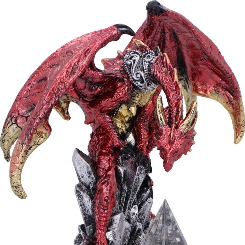 A fierce red dragon protects a crystal prism. The LED feature adds a touch of magic to this fantasy style figurine. H18.5cm.