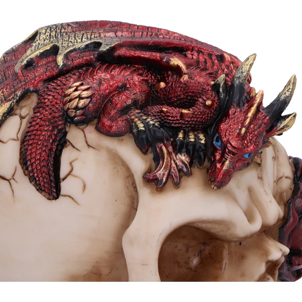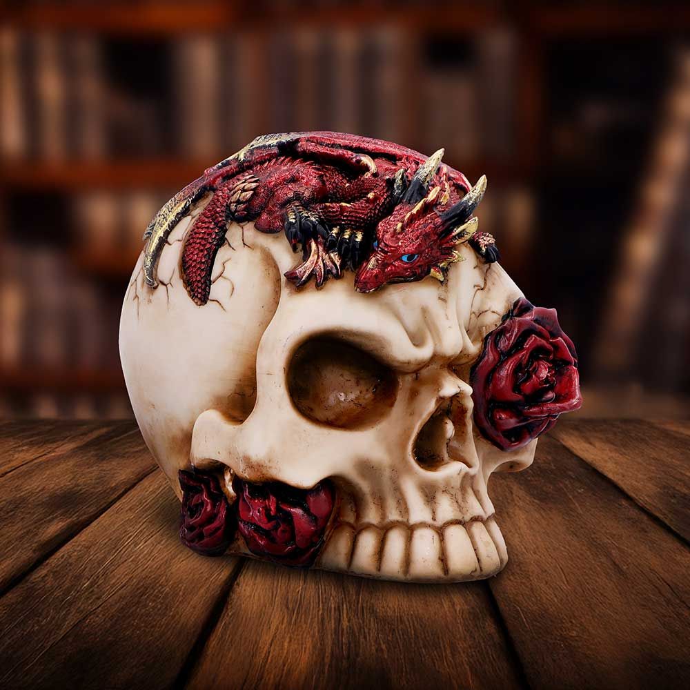 Hand-painted crimson dragon figurine perched atop a cream-colored skull