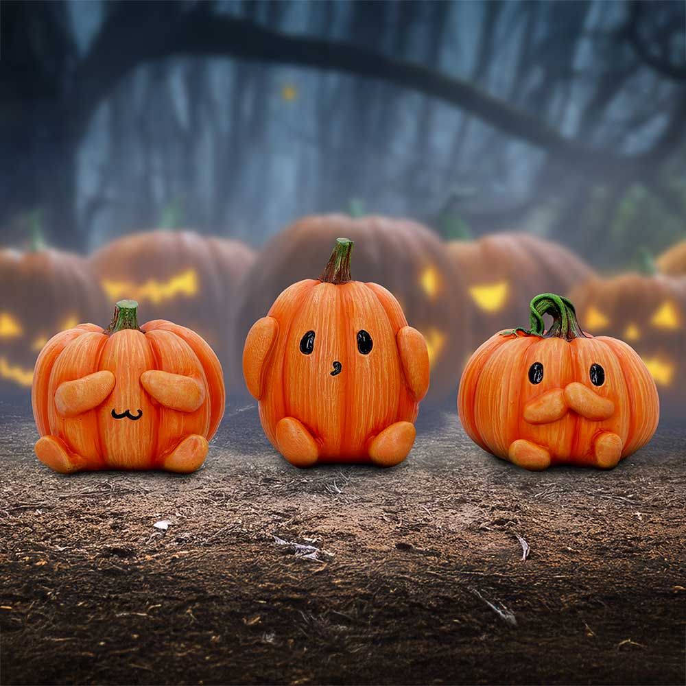 A charming trio of pumpkin figurines styled in the classic “hear no evil, see no evil, speak no evil” poses, perfect for Halloween or year-round spooky decor.