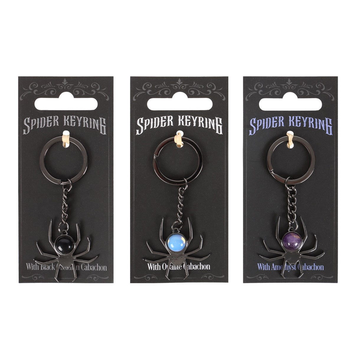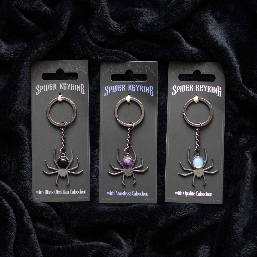 Our crystal spider keyrings make a creepy addition to your keys! Choose from: Black Obsidian, Opalite, and Amethyst.