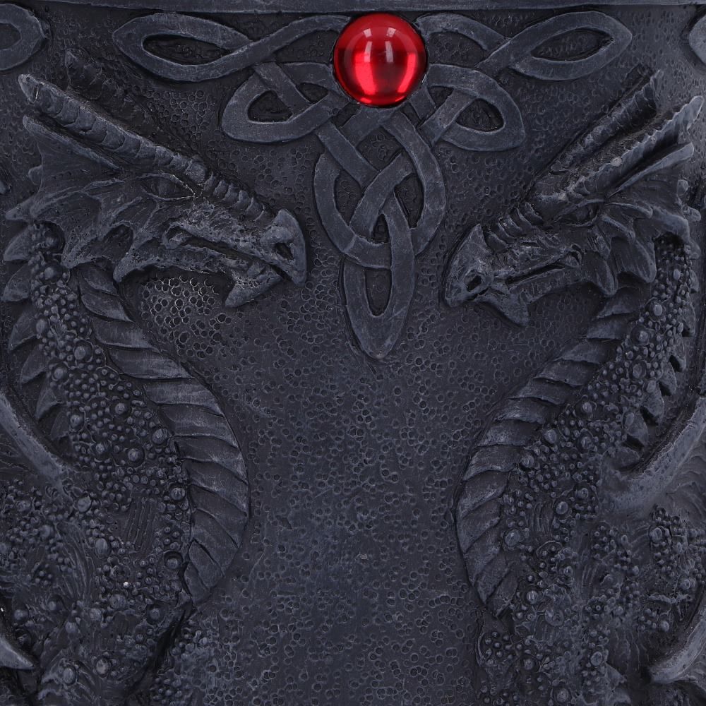 Decorated with Celtic knots and dragon pairs, under ruby gemstones