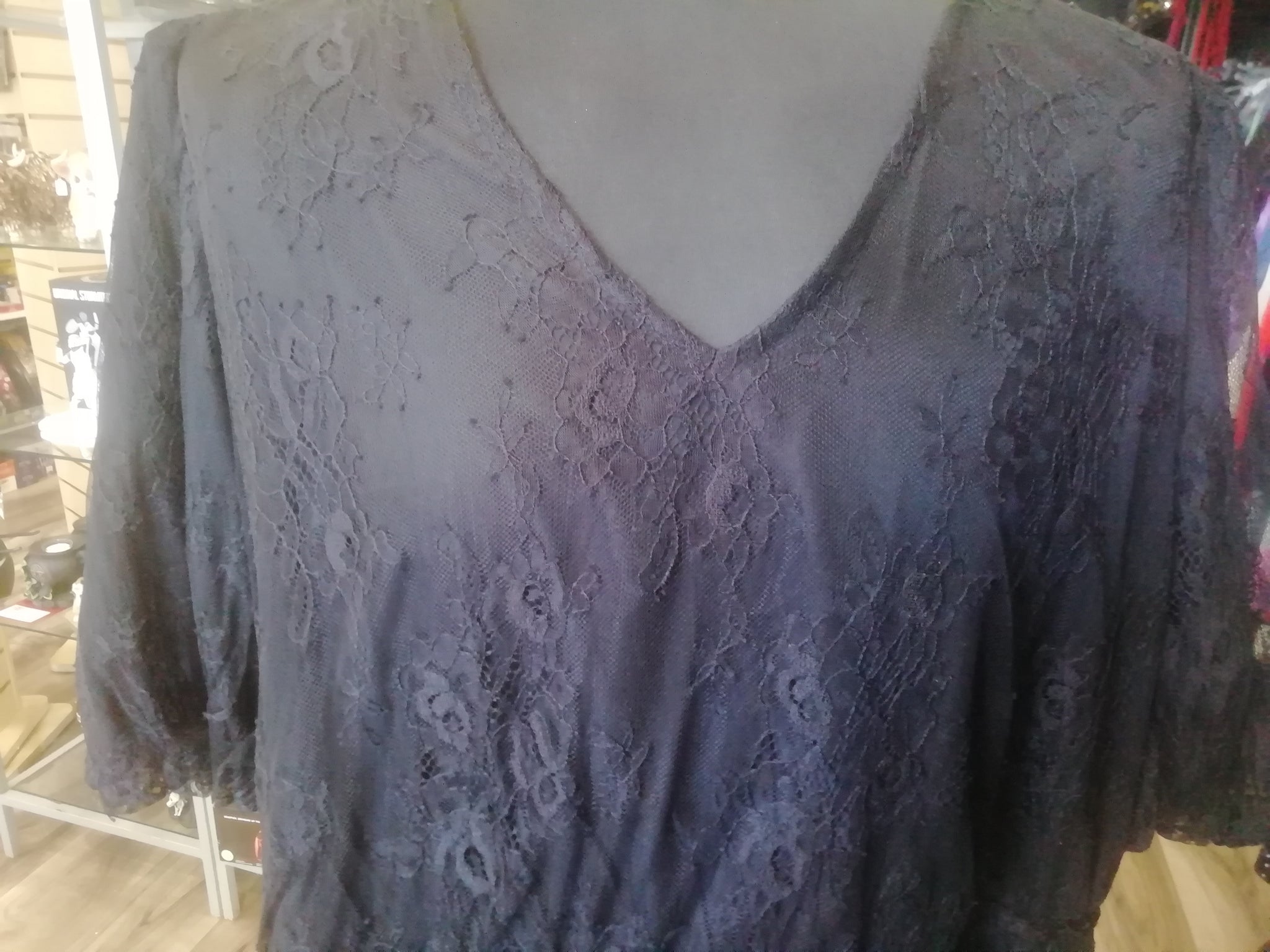 Pretty black dress, lace with lining, short sleeves. Zip fasten at back. By George. Ladies size 24.