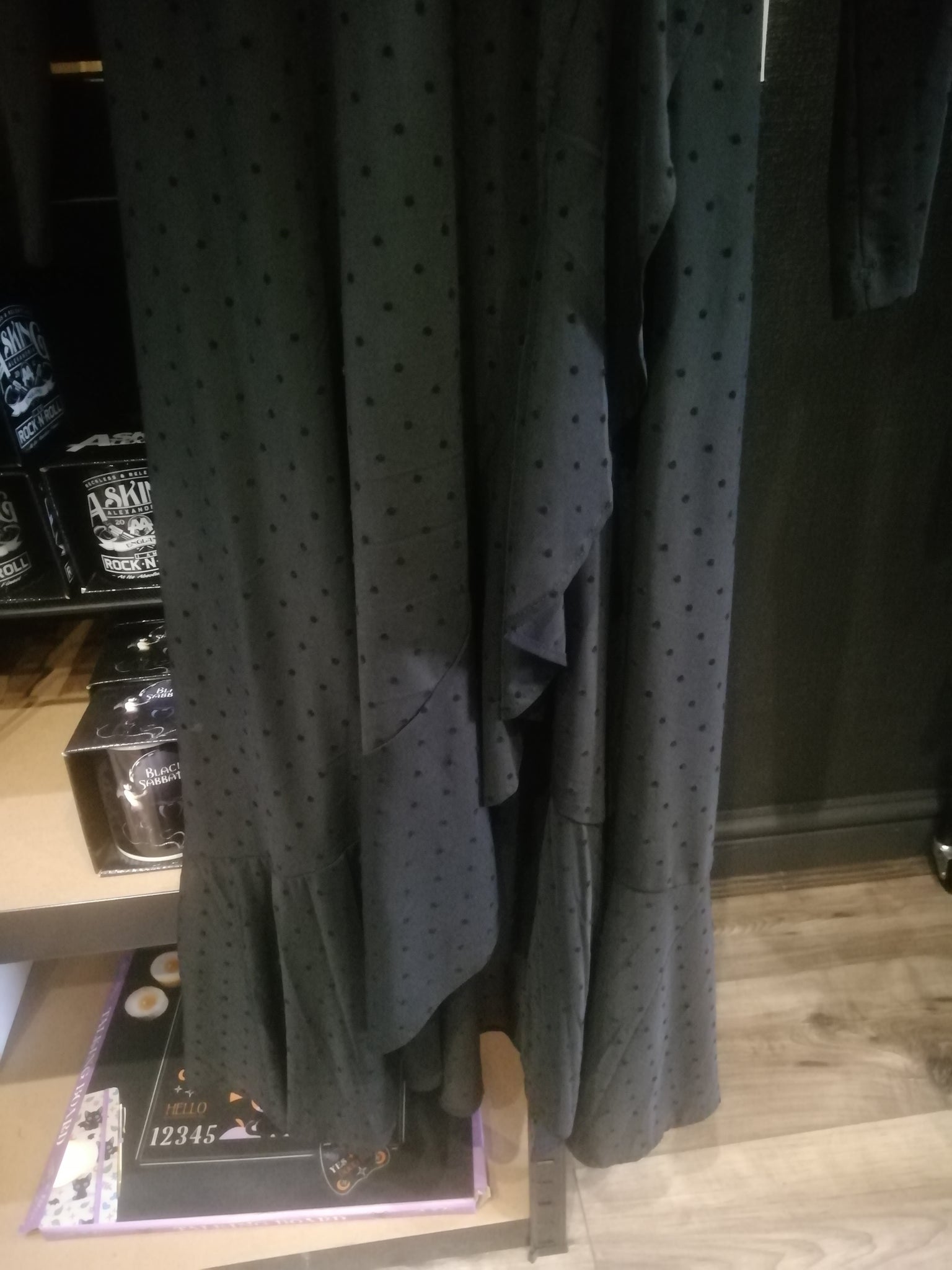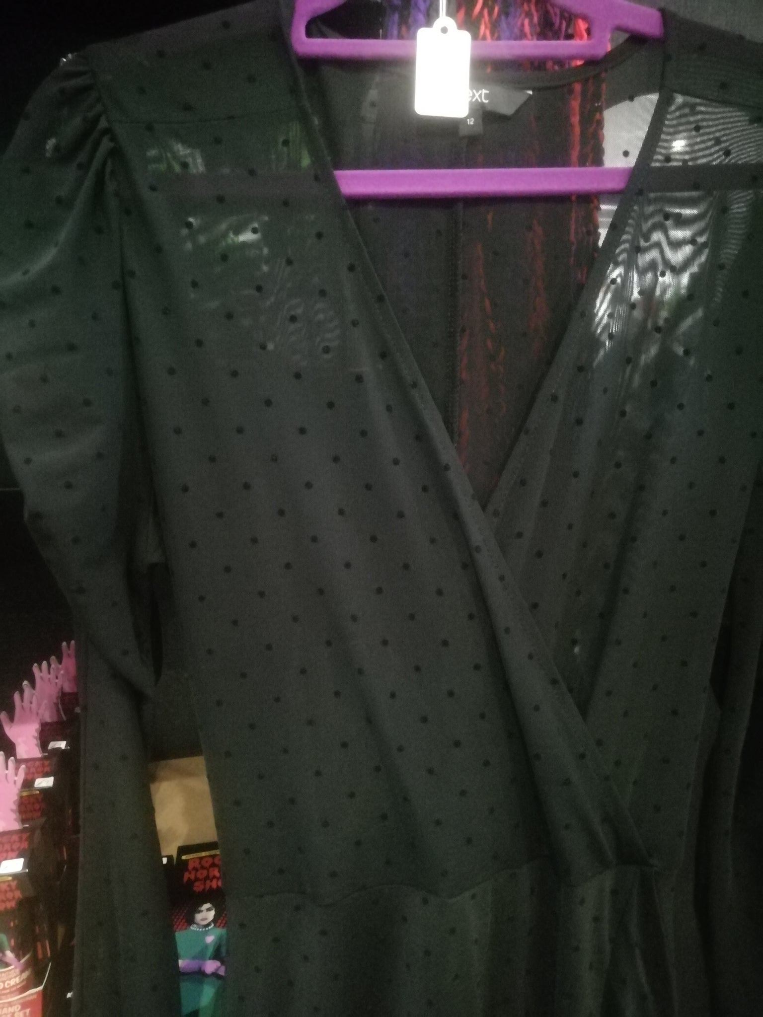 Long black sheer dress with polka dot pattern. Gothic witchy vibes. Puff sleeves, v neck and tie belt. By Next. Size 12. Great condition.