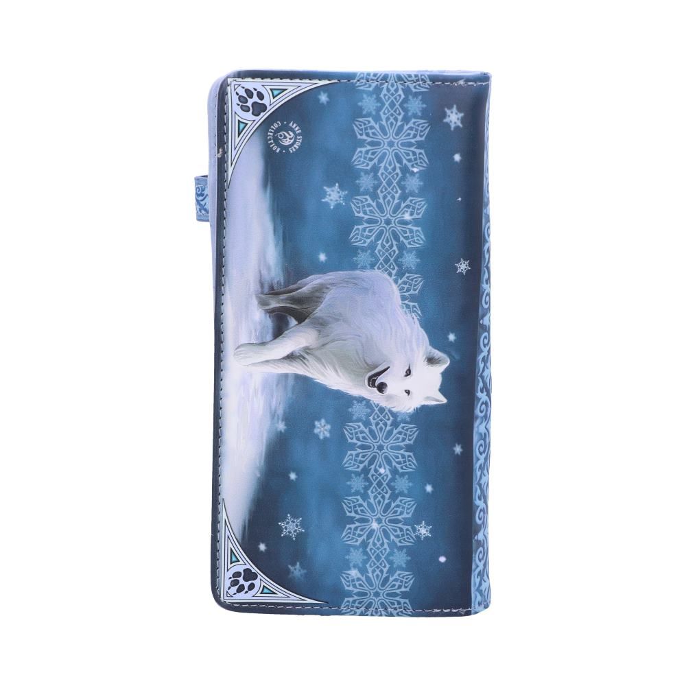 This stylish embossed purse features the striking artwork by Anne Stokes titled 'Winter Guardians'. A woman dressed in a flowing white dress and cloak walks through the snowy forest. Two stunning white wolves walk by her side. A white wolf is also pictured on the back, along with beautiful snowflakes and wolf paw prints. The purse measures 18.5cm long and has a press-stud fasten. There's multiple card slots and a spacious coin compartment with zip.