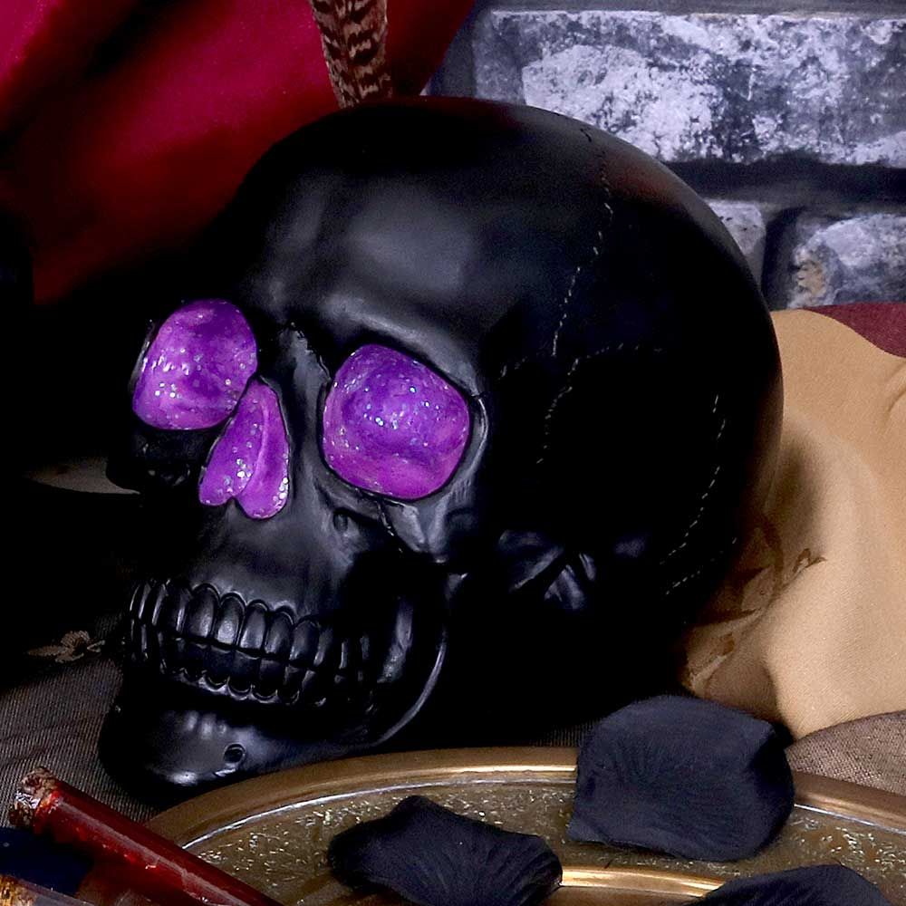 Plain matte black skull complete with a sparkling pink/purple geode accent