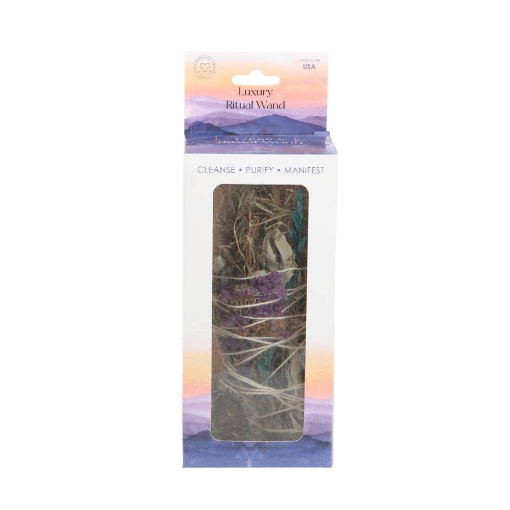 The act of ‘smudging’ is a traditional Native American practice used to cleanse and purify spaces using the smoke of burning sacred herbs. Sustainably sourced and made in the USA, this beautiful ritual wand features fragrant rosemary, white sage, lavender flowers, abalone shell pieces and a raw aventurine crystal thoughtfully handtied into a tight bundle for burning and display.