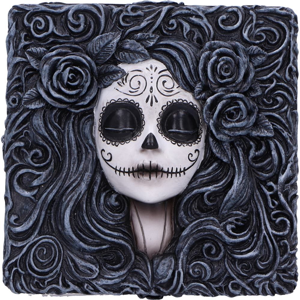 Featuring a removable lid with this beautifully sculpted Day of the Dead girl’s face in a black and white palette, surrounded by detailed flower motifs around the body of the box.