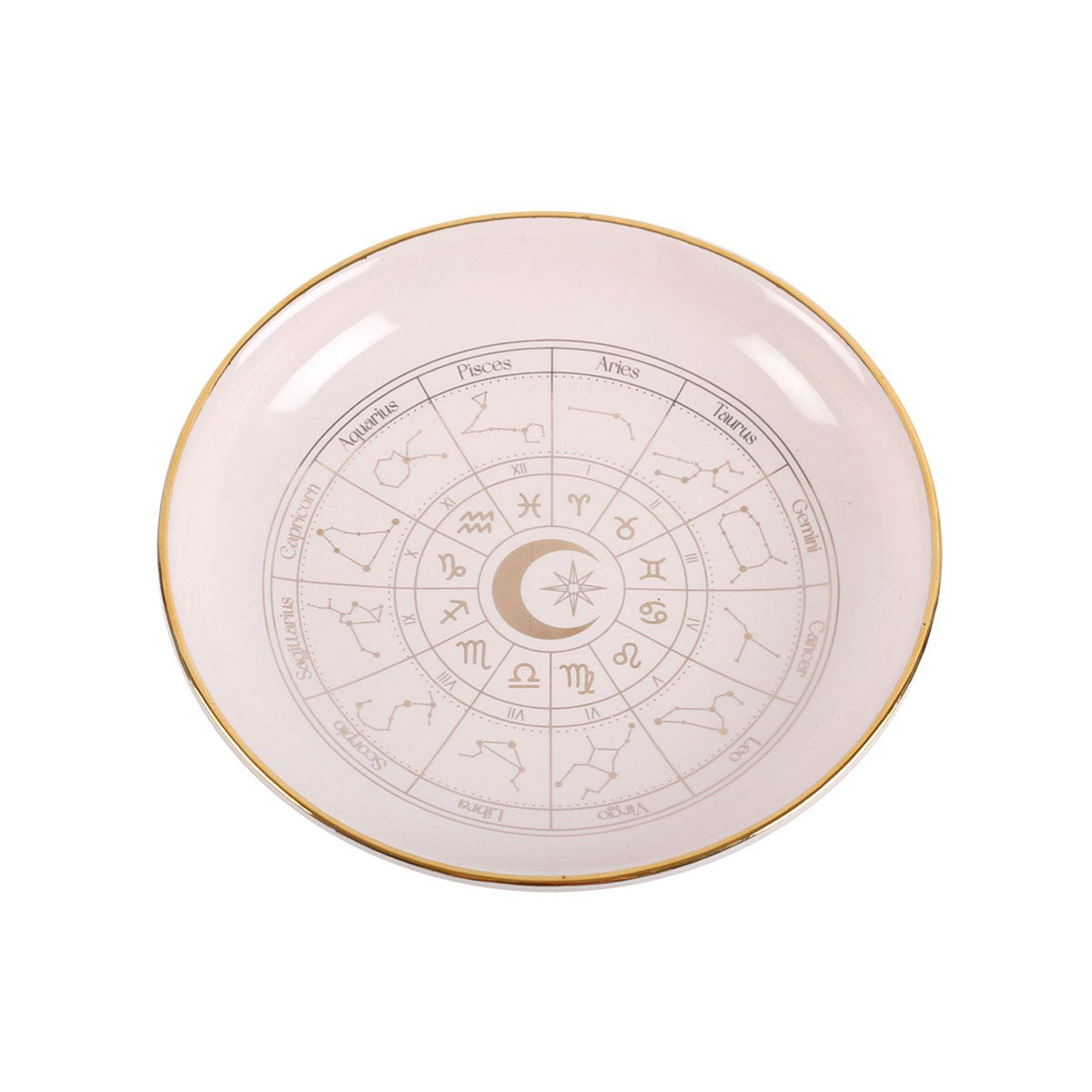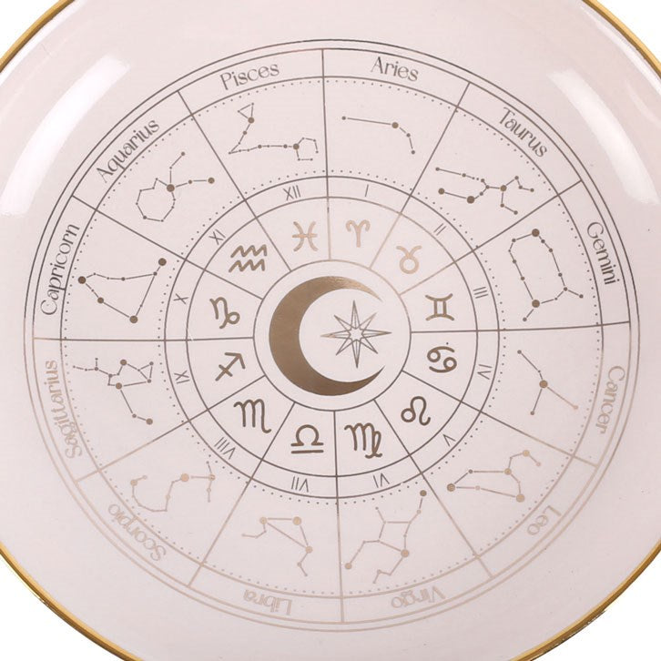 This beautiful off-white trinket dish depicts the astrology wheel in intricate, gold effect detail for a premium look. A gorgeous piece for storing treasured trinkets and jewellery, and a finishing touch for any home with celestial-inspired décor.