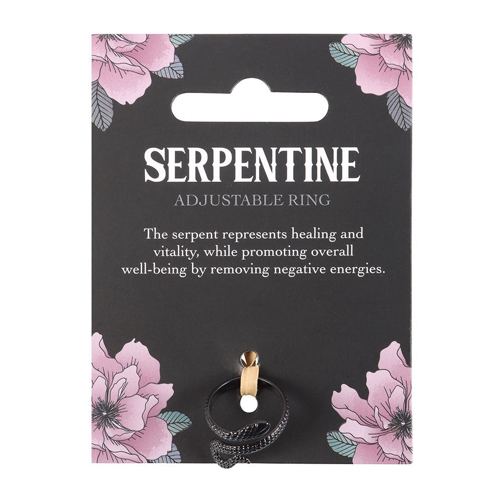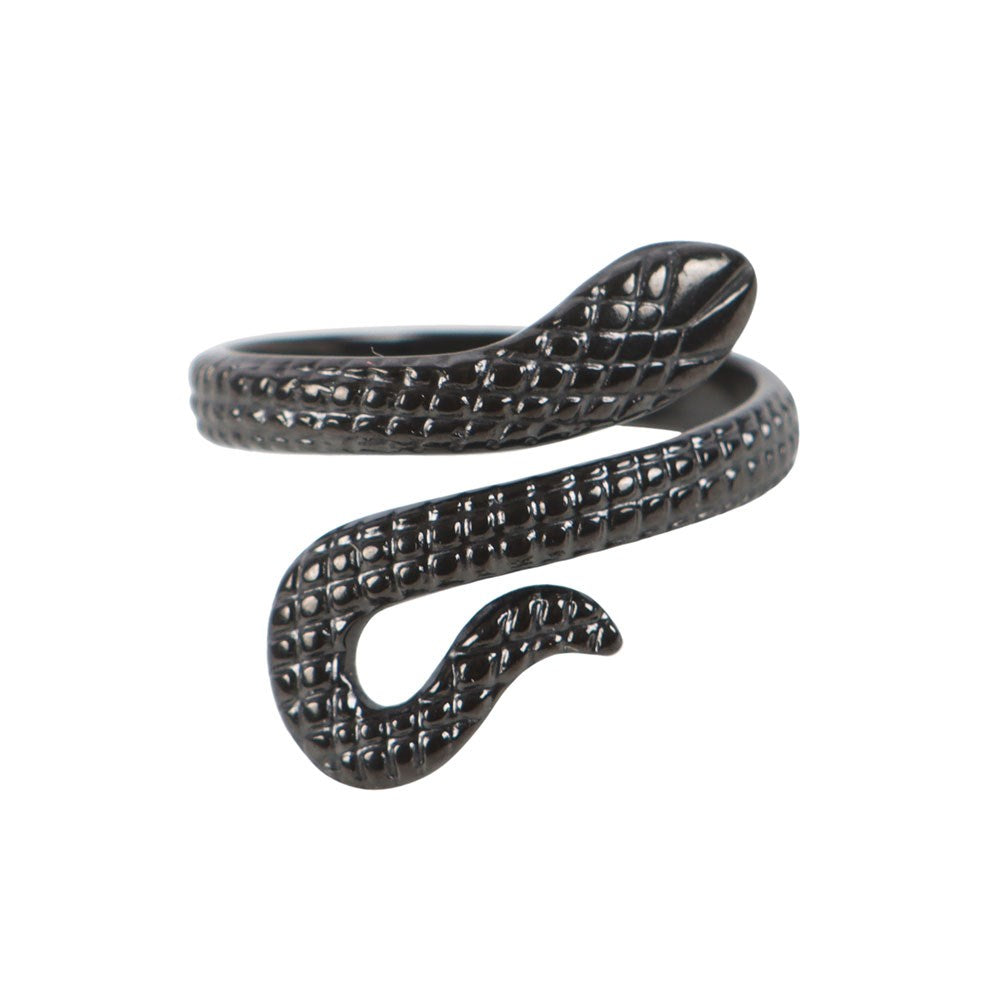 This dark and elegant ring features a delicate snake in a cool black finish. It's adjustable fit allows it to coil around any finger, making it a striking and versatile accessory. Presented on a floral backing card and perfect for gifting. Nickel-free stainless steel.